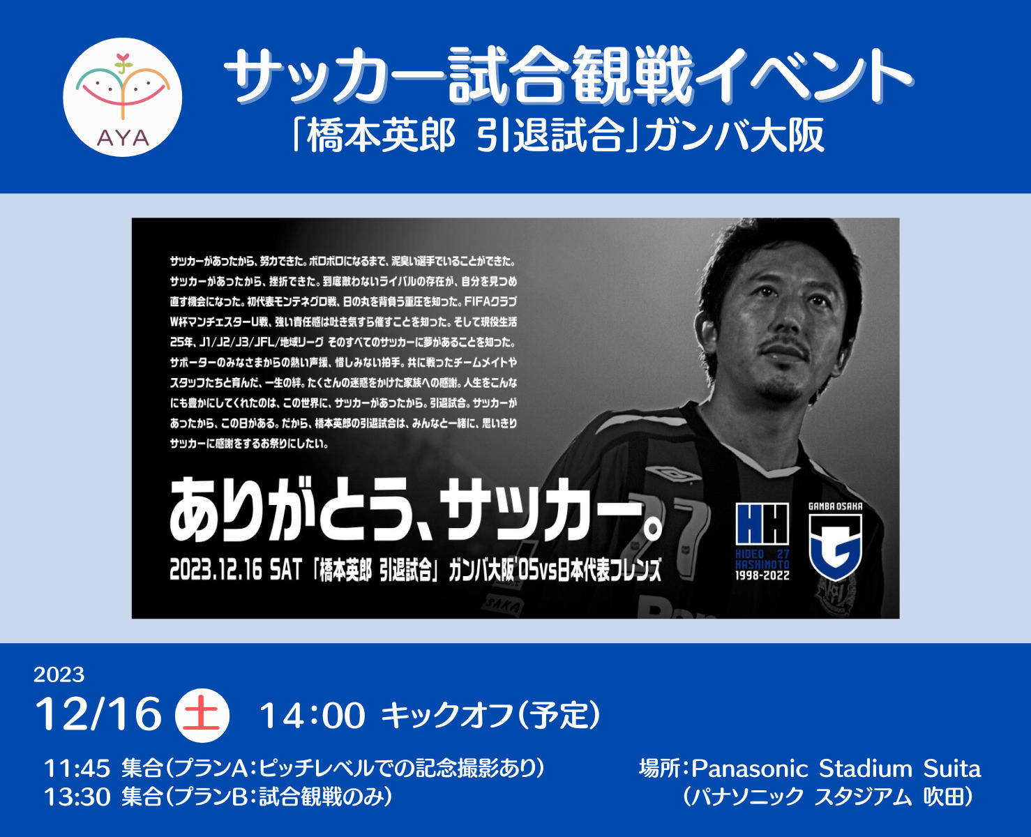 サッカー観戦 ガンバ大阪「橋本英郎 引退試合」 開催!