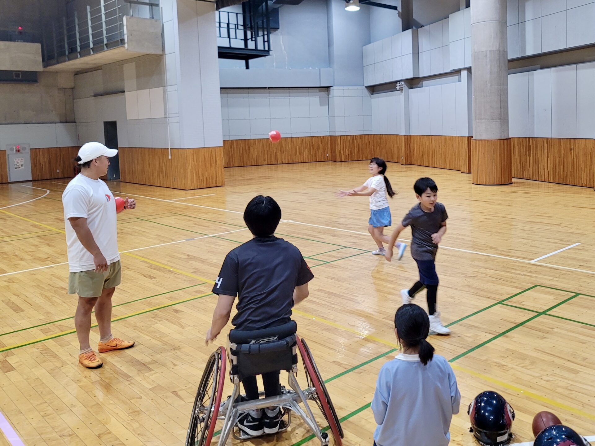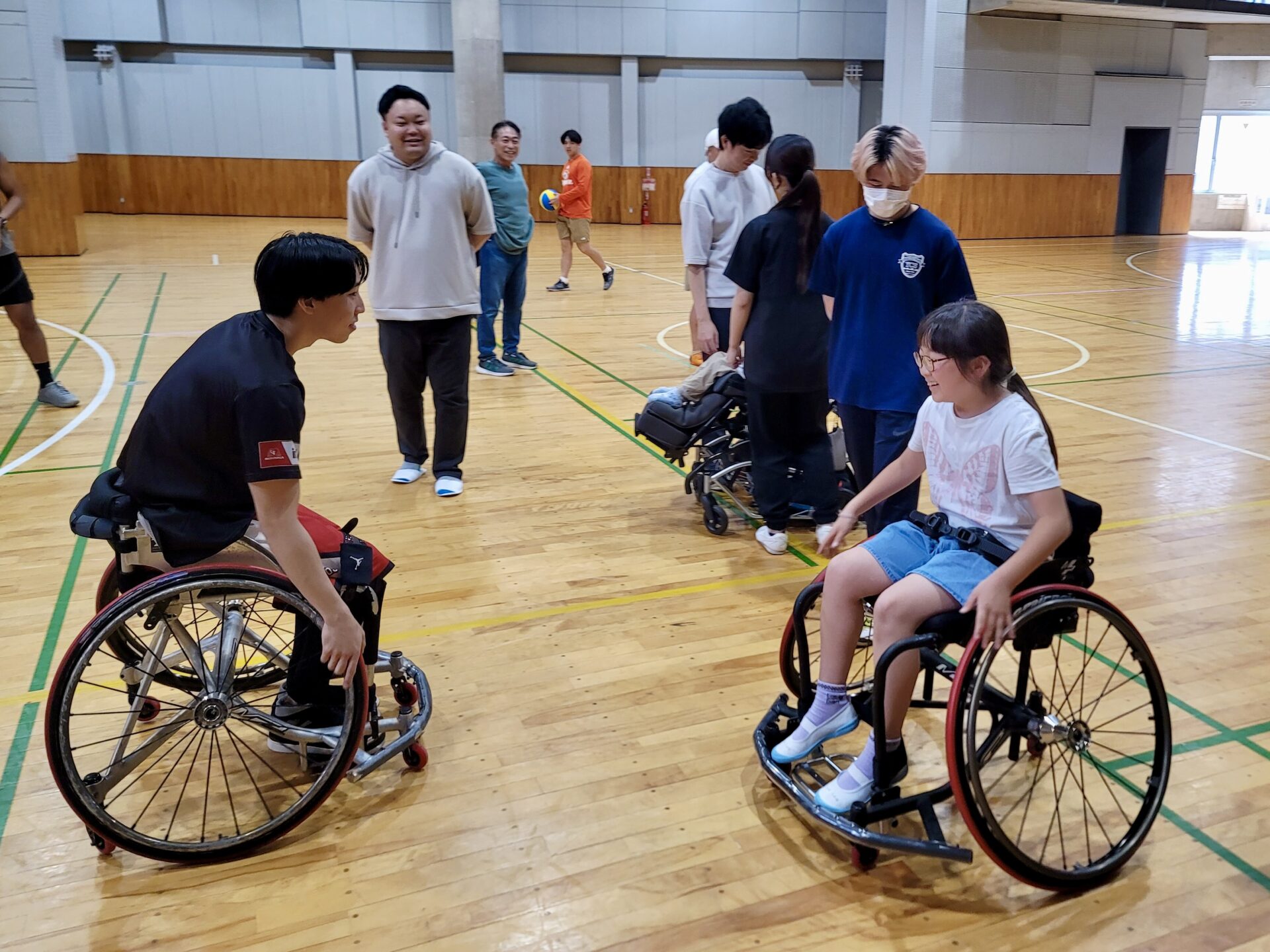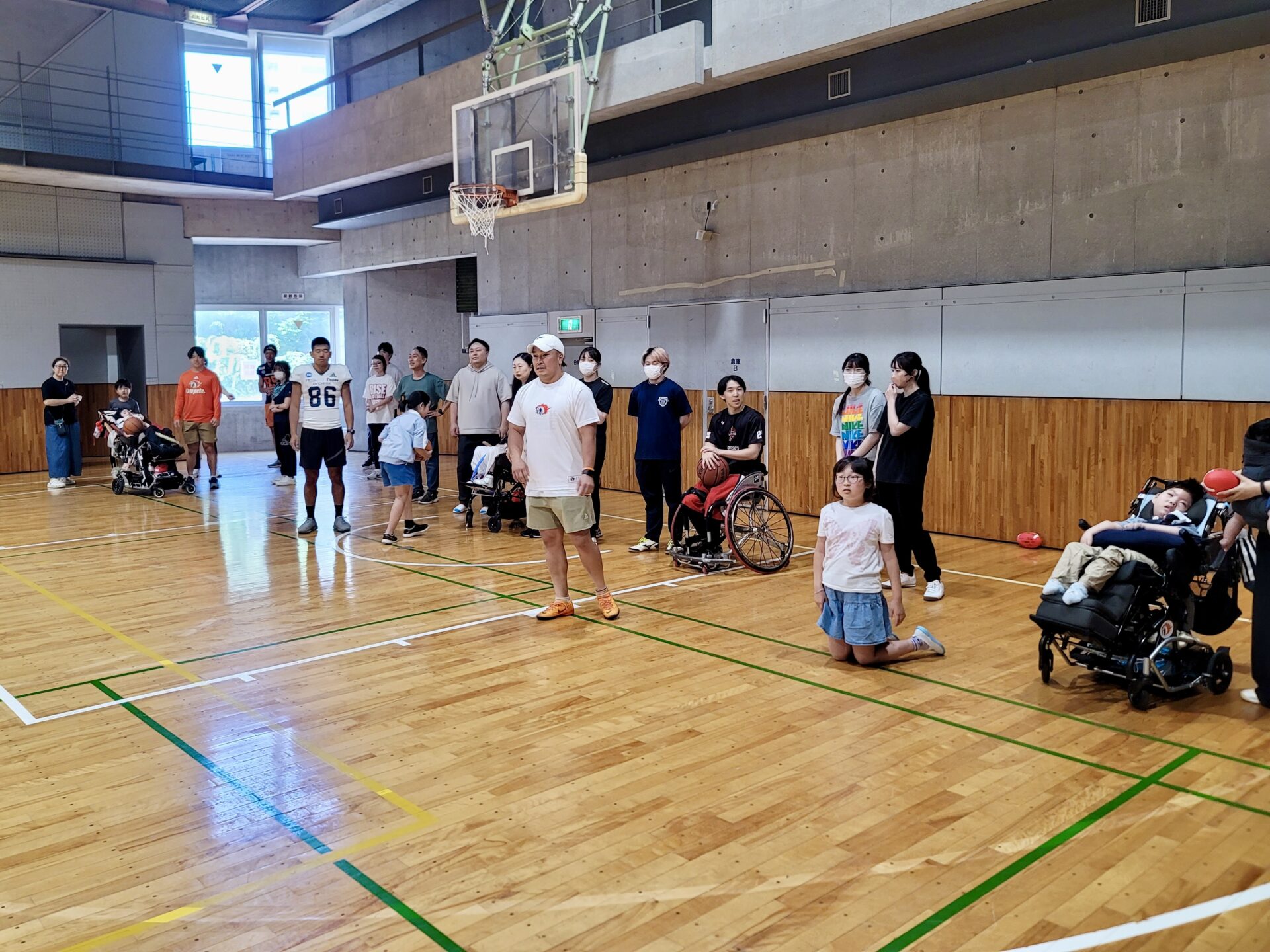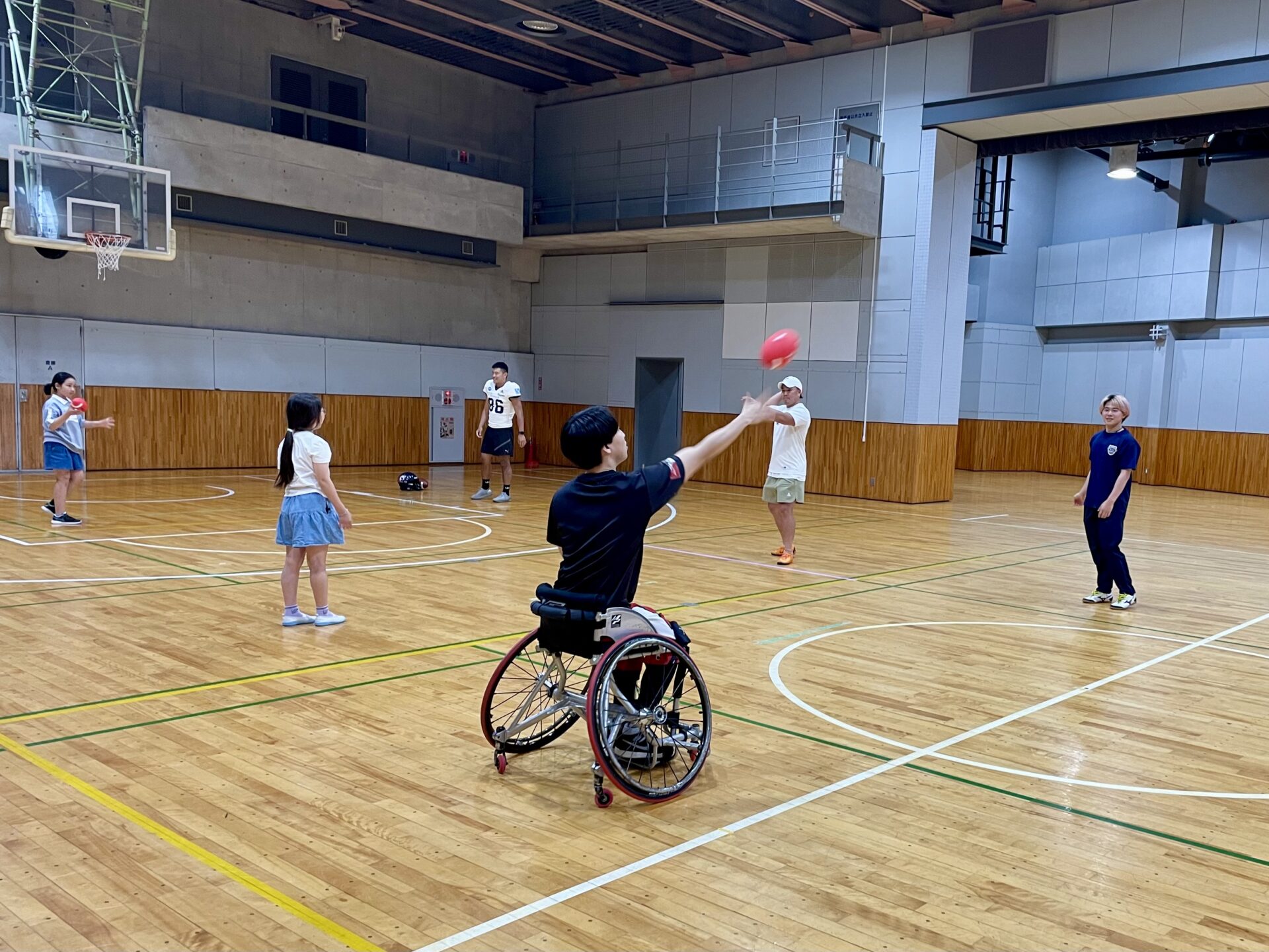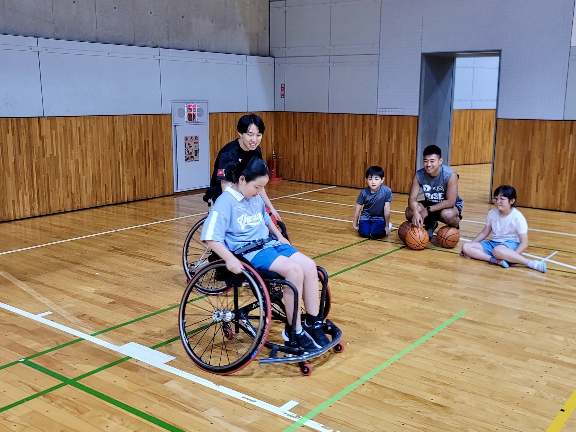 子どもたちはみんなで車いすバスケを体験しました。