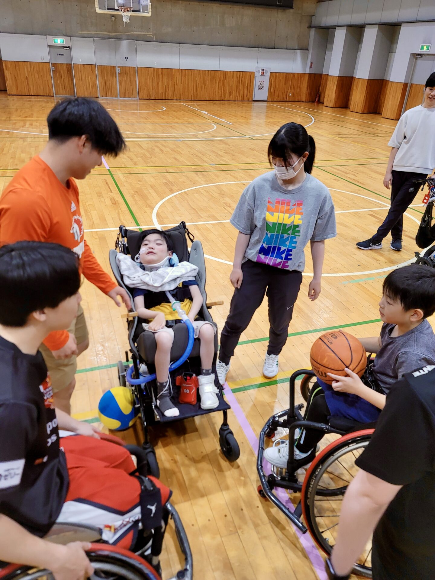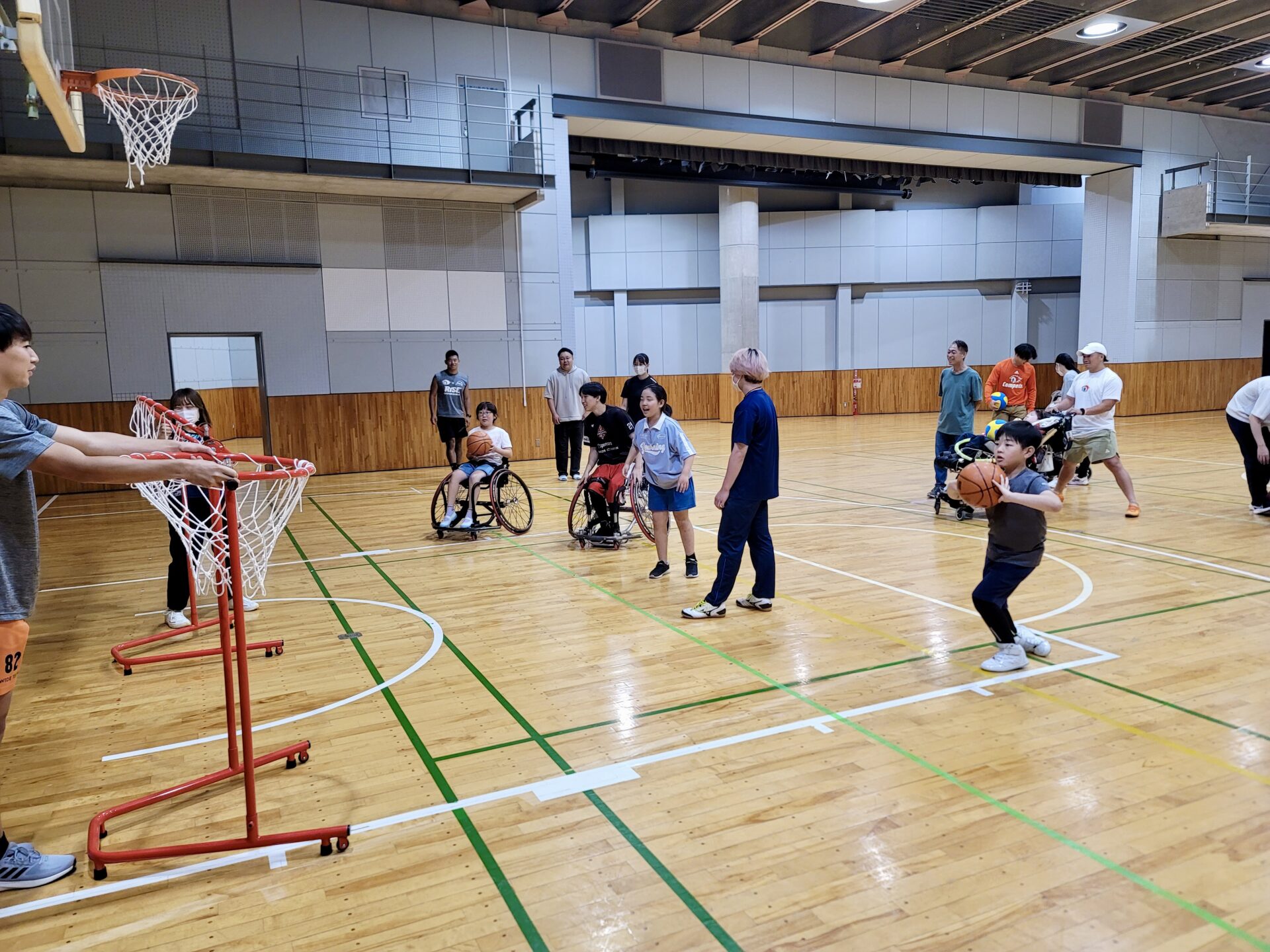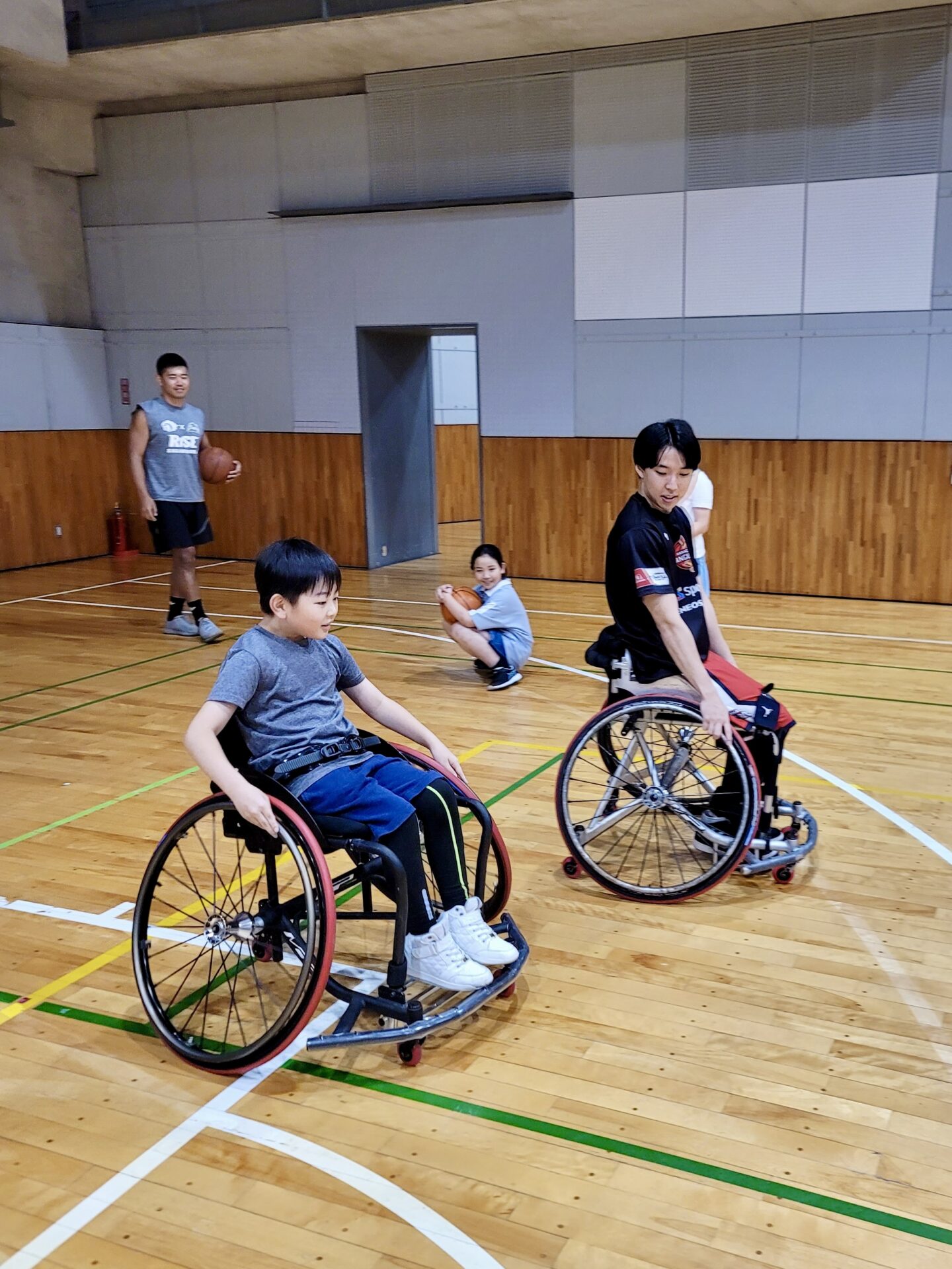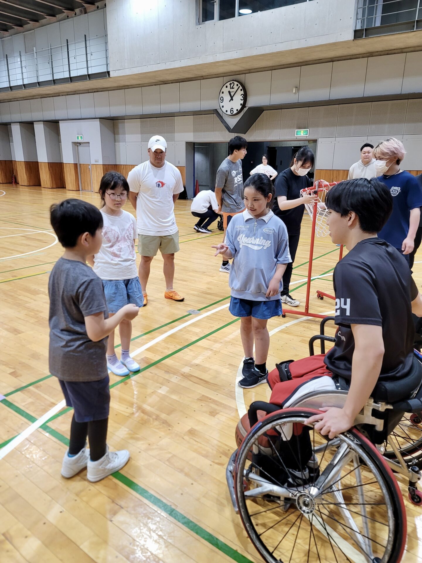 子どもたちはみんなで車いすバスケを体験しました。